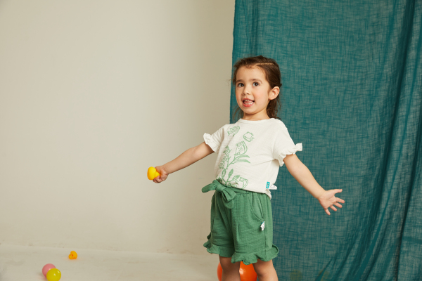 清新的绿色裤装采用荷叶边拼接的点缀让穿搭更加甜美可爱。搭配纯白色的的上衣短袖,同样的绿色印花和荷叶边拼接让整体更和谐,穿起来萌力十足。天然的面料也是让孩子无拘无束,更加舒适哦。
